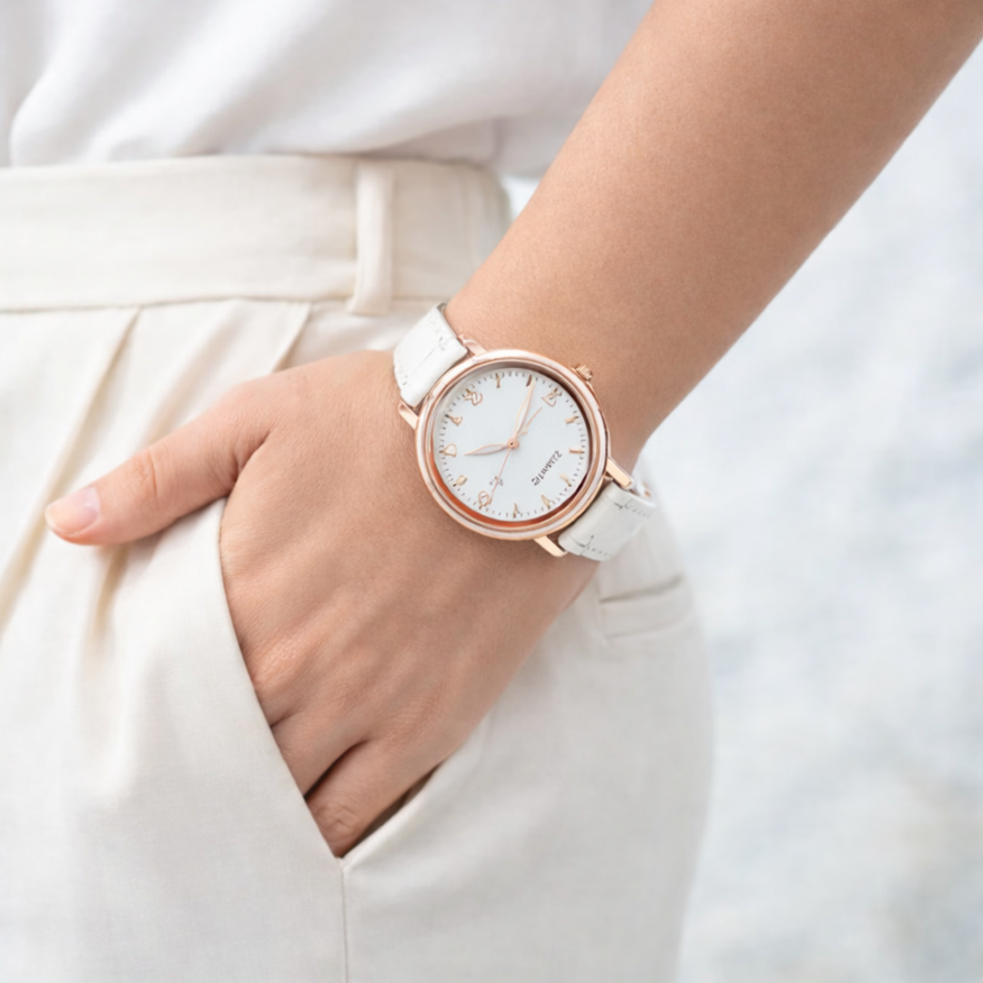 The Audrey | Leather Band Watches exudes refined sophistication, seamlessly transitioning from daywear to evening elegance. With a sleek stainless-steel case and a luminescent white dial framed by crystal accents, each detail reflects thoughtful craftsmanship that complements both casual and formal ensembles.