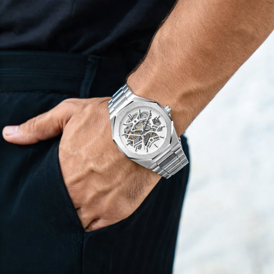Crafted to command attention, this mechanical watch features an open dial, luminous markers, and a stainless steel band. Designed for those who appreciate bold aesthetics with mechanical precision.