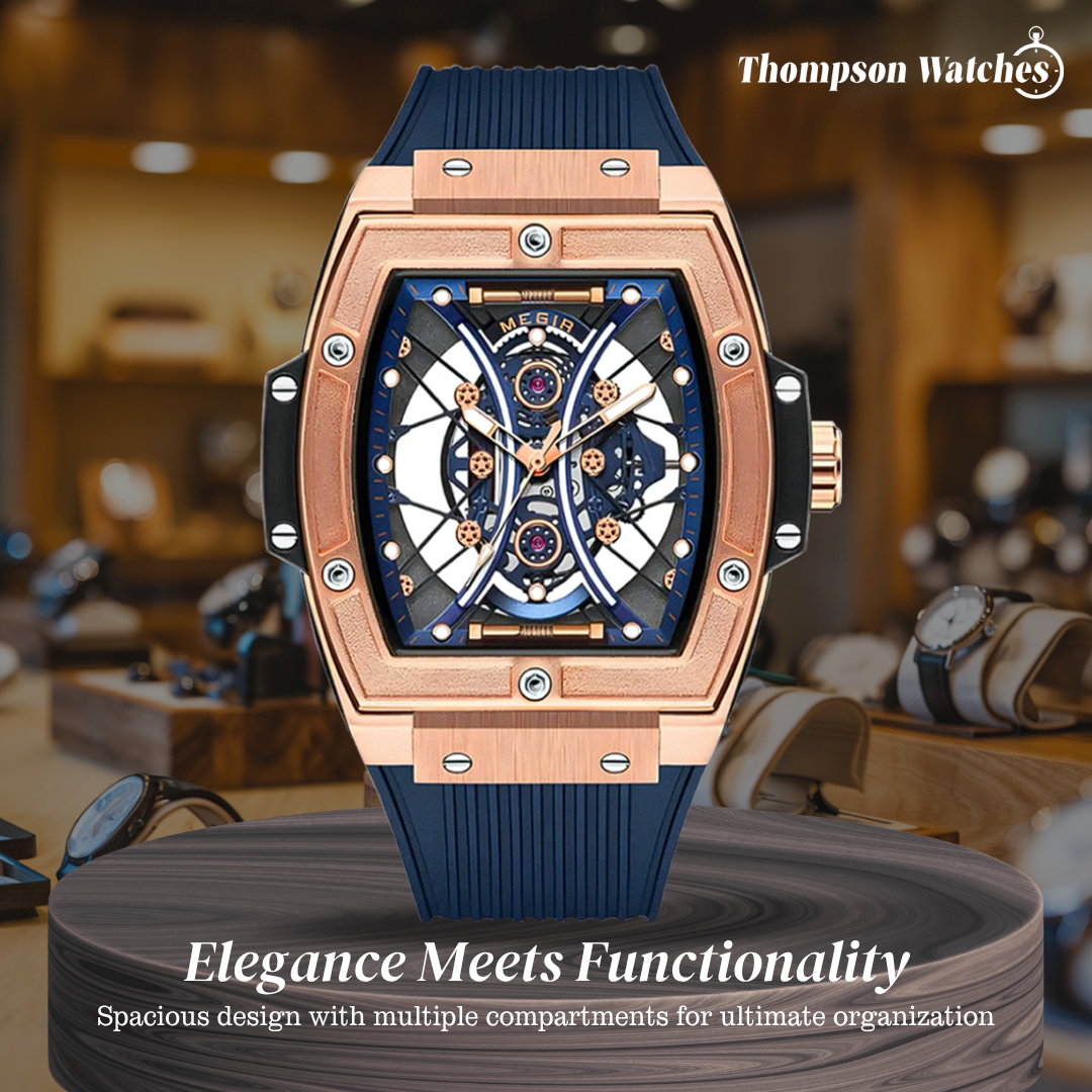 The Ryker watch captures attention with its bold tonneau-shaped case and open skeleton dial. A fusion of function and design, perfect for those who appreciate contemporary edge.