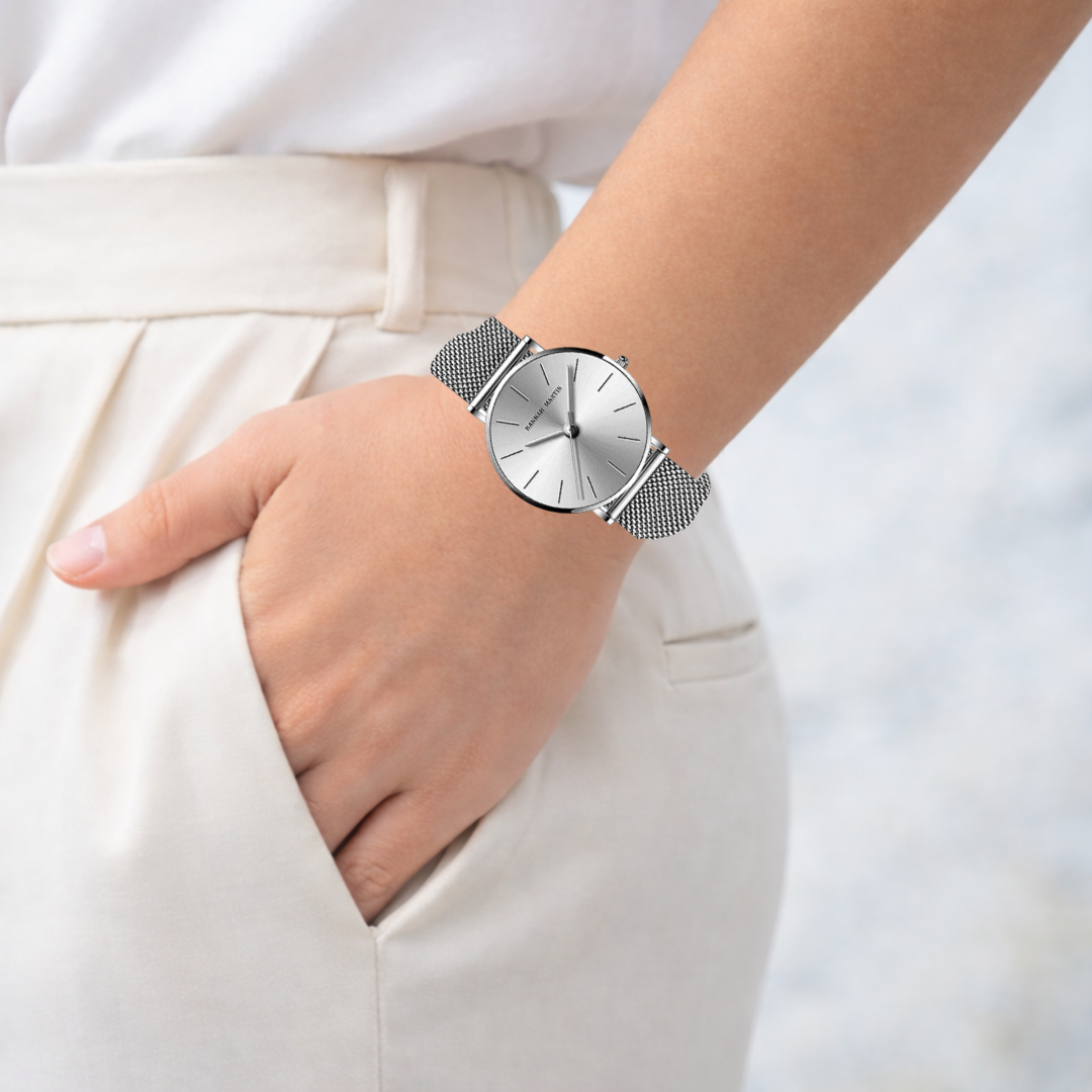 The Valerie | Minimalist and Versatile Design Women’s Watch embodies timeless sophistication with its sleek, understated design. Featuring a clean dial and a choice of elegant bands, this watch seamlessly transitions from day to night, making it a versatile addition to any wardrobe.