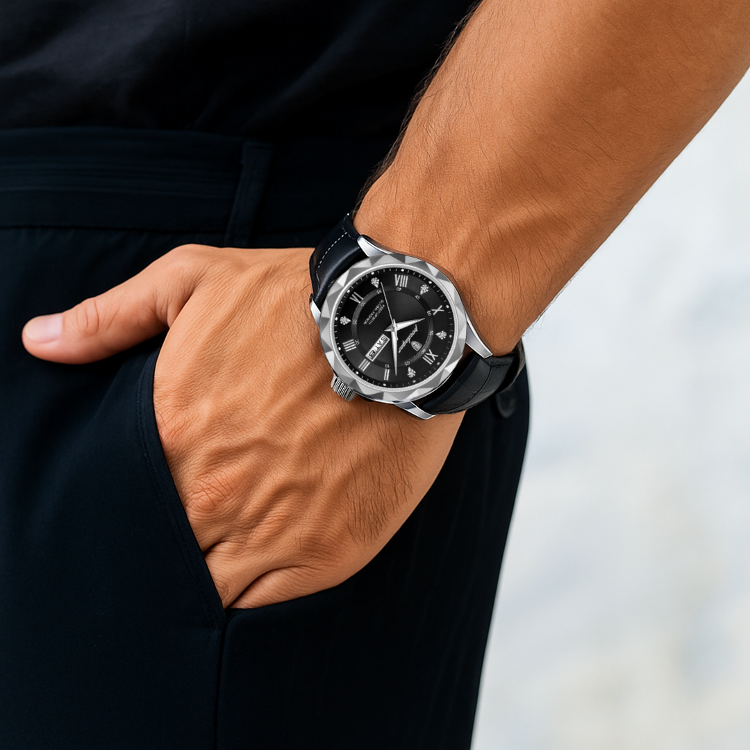 The Levi | Men's Quartz Watch | 41mm with Date and Day Display merges sleek design with essential practicality. Built to complement both casual and formal looks, this watch brings confidence to your wrist with every tick.