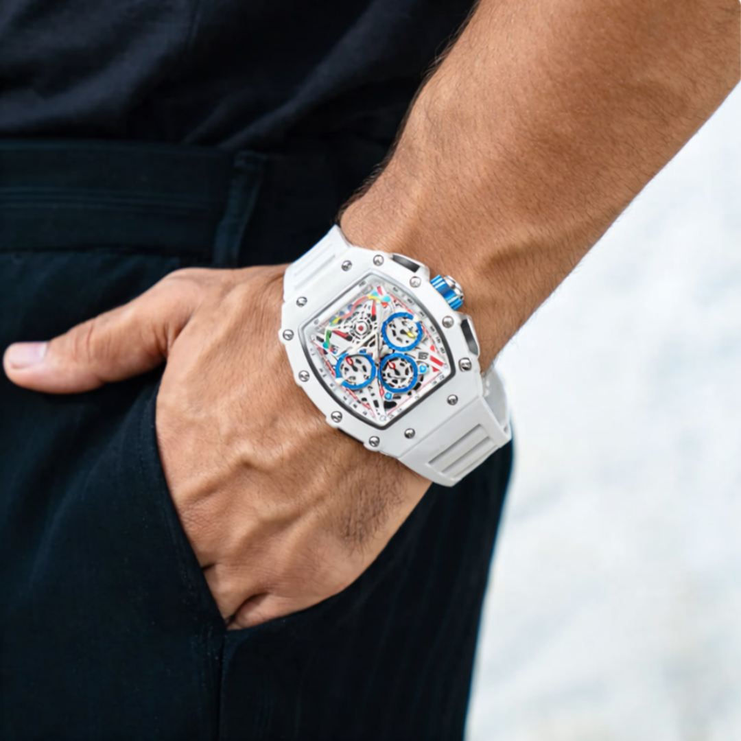 Crafted for those who crave edge and elegance, this watch reveals inner movements through a skeleton dial. Its vibrant highlights and sleek frame offer a modern, eye-catching twist.