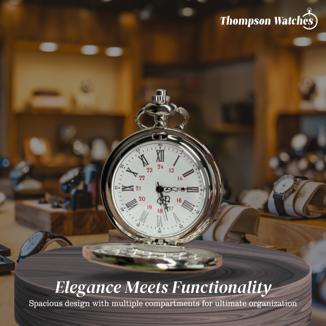The Luther pocket watch captures old-world charm. Roman numerals enhance its classic appeal. A sophisticated accessory for collectors and style lovers.